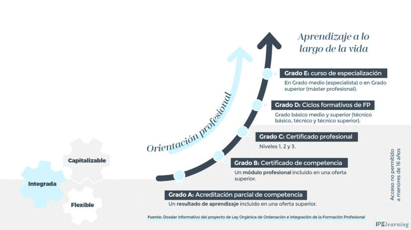 Como novedad a destacar de la nueva ley de FP online, se establece un Catálogo Nacional de Ofertas de Formación Profesional que incluye, por primera vez, una oferta flexible y accesible basada en el reconocimiento y acreditación de competencias y de orientación profesional a través de itinerarios formativos que se articulan en cinco grados de cualificación acumulables y ascendentes (A, B, C, D y E), que irán desde los títulos de especialización a las microformaciones.